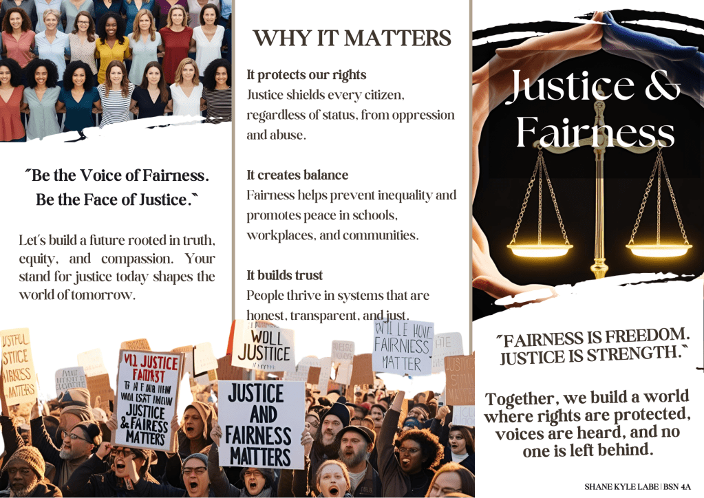 Justice and Fairness Posted byLABE, Shane KyleMay 8, 2025May 8, 2025Posted inUncategorized BY: SHANE KYLE LABE | BSN 4A Share this: Share on X (Opens in new window) X Share on Facebook (Opens in new window) Facebook Like Loading...